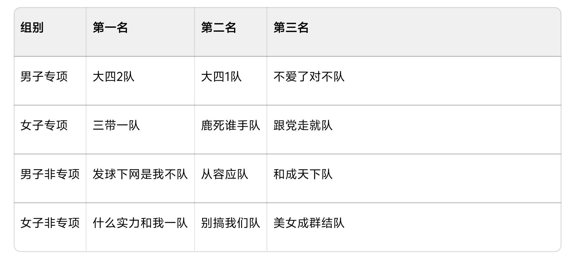 比赛采用循环赛制,各队选手在赛场上奋力拼搏,展现了高超的球技和默契的团队配合。发球如炮弹般呼啸而过,二传手精准调度,主攻手高高跃起完成势大力沉的扣杀,副攻手则筑起坚固的拦网防线,引得场边观众阵阵欢呼。各组别获奖名单如下: