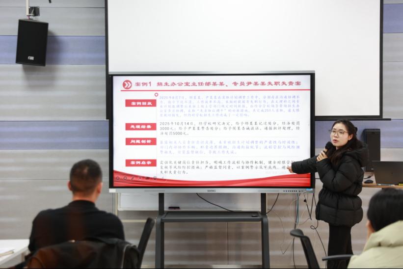 会议伊始,廉洁微课堂环节聚焦招生、教务、师德师风等重点领域,通过政策法规解读、典型案例剖析、风险提示提醒三重维度,强化教职工纪律意识。结合学校近期通报的教学违规、失职失责等案例,学院强调全体教职工需严守师德红线与工作底线,在教学管理、学生服务等各环节压实责任、规范流程,尤其要杜绝课堂违规、工作疏忽等问题,以严谨作风保障学生权益,筑牢学院合规育人防线。