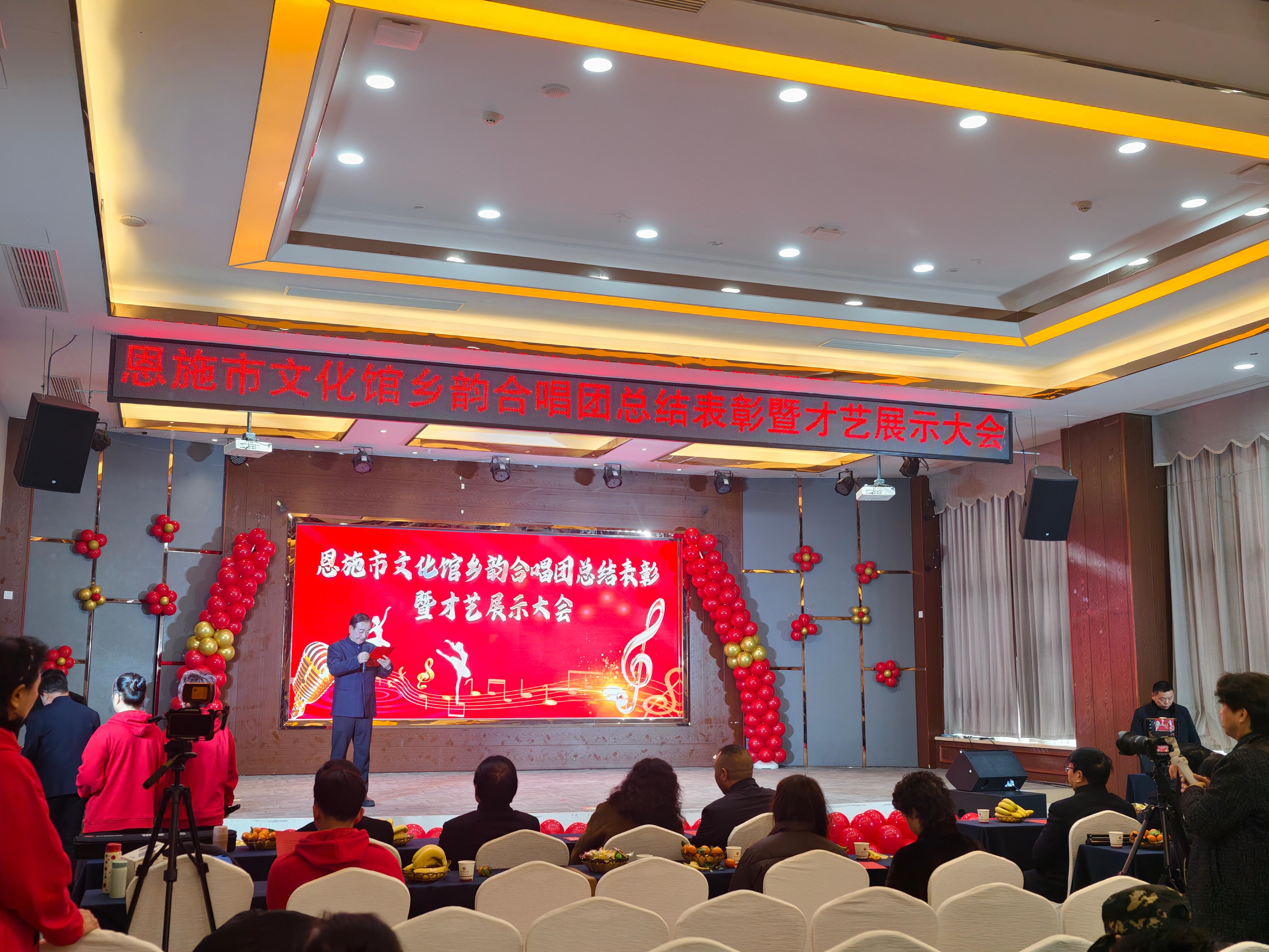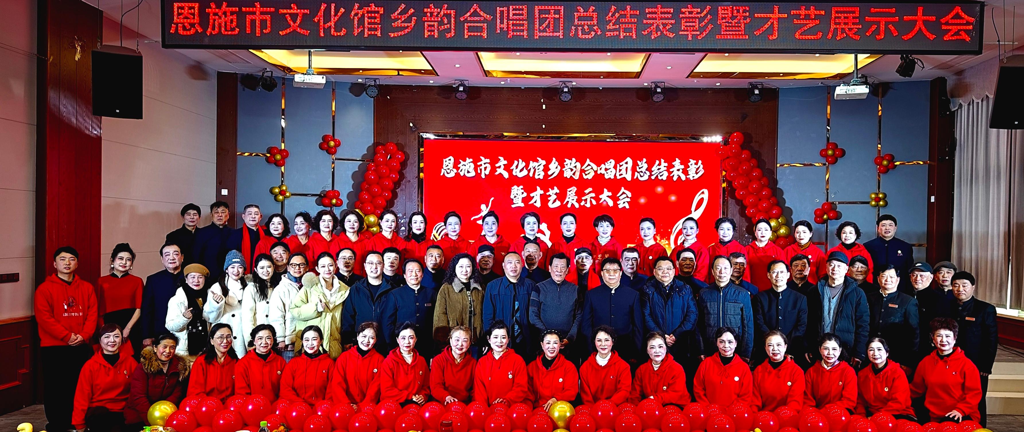 1月9日,恩施市文化馆乡韵合唱团总结表彰暨才艺展示大会现场,由湖北恩施学院音乐系韩冬、王娅、陈薇佳、蒋旋飞四位教师指导的四声部大合唱《世界上只有一个中国》,作为压轴节目精彩亮相并完成验收,以饱满的艺术表现力与真挚的家国情怀,为本次校地社会服务项目画上圆满句号,也为大会增添了浓厚的红色氛围。
