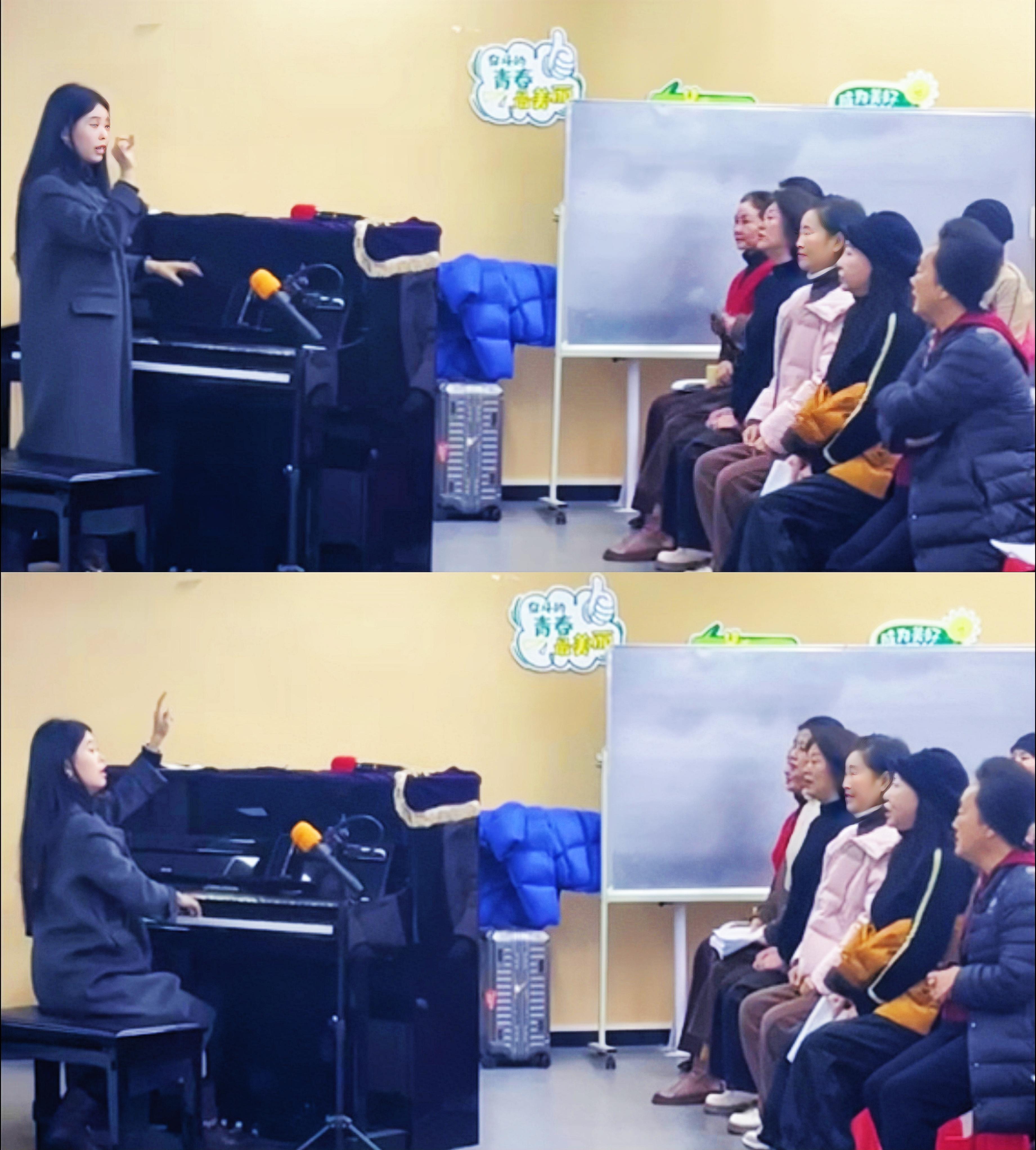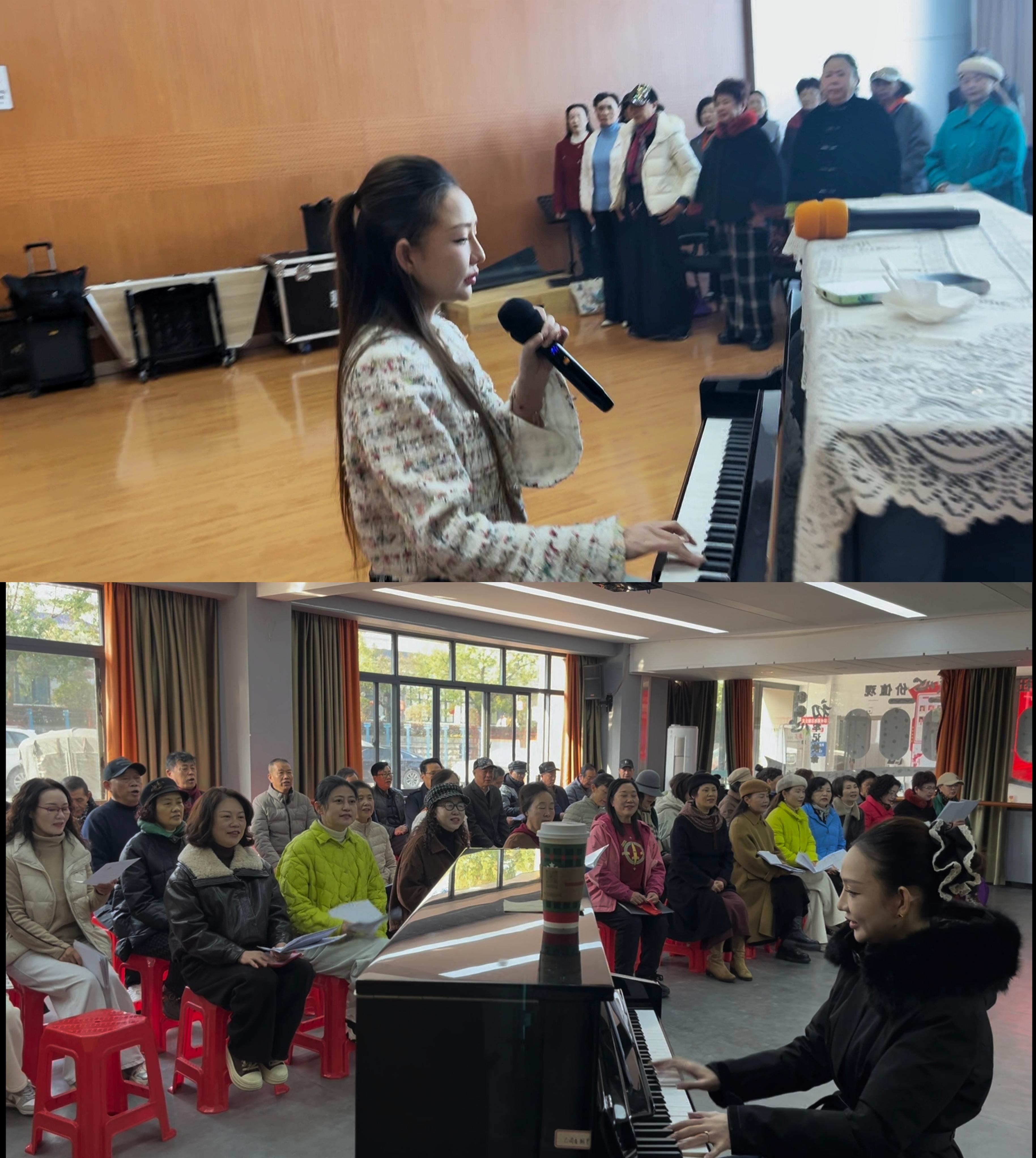 自2025年9月项目启动以来,四位教师立足乡韵合唱团成员的基础特点与实际需求,制定了“基础夯实—专项攻坚—整合提升”的系统化培训方案。基础训练阶段,团队聚焦合唱核心基本功,从胸腹联合呼吸法训练入手,通过“快吸慢吐”、“狗喘气”、“气息操”等趣味练习帮助团员掌握气息控制技巧,纠正“大声喊唱”的误区,建立“轻声高位置”的科学发声习惯;同时开展识谱教学与视唱练耳训练,结合《世界上只有一个中国》简谱,强化团员对音准、节奏的把握,为多声部合唱筑牢基础。专项攻坚阶段,针对四声部合唱的难点,教师团队采用分声部教学与合练结合的方式,逐一突破声部融合难题——女高、女低声部侧重音色统一与共鸣协调,男高、男低声部强化音准稳定性与力度控制,通过三度、六度音程专项练习,提升声部间的和声契合度;同时细化咬字吐字训练,确保歌词清晰传递,让爱国情感与旋律表达精准契合。整合提升阶段,团队围绕作品整体艺术呈现,优化呼吸衔接、强弱层次与情感递进,指导团员在旋律起伏中融入对家国的赤诚情怀,实现“技术规范”与“情感真挚”的双重目标。乡韵合唱团罗团长高度评价:“四位教师用专业、耐心的指导解决了我们合唱团的诸多难题,不仅让团员们的演唱水平实现质的飞跃,更让基层文艺队伍感受到了高校专业资源的力量。”